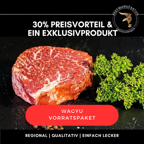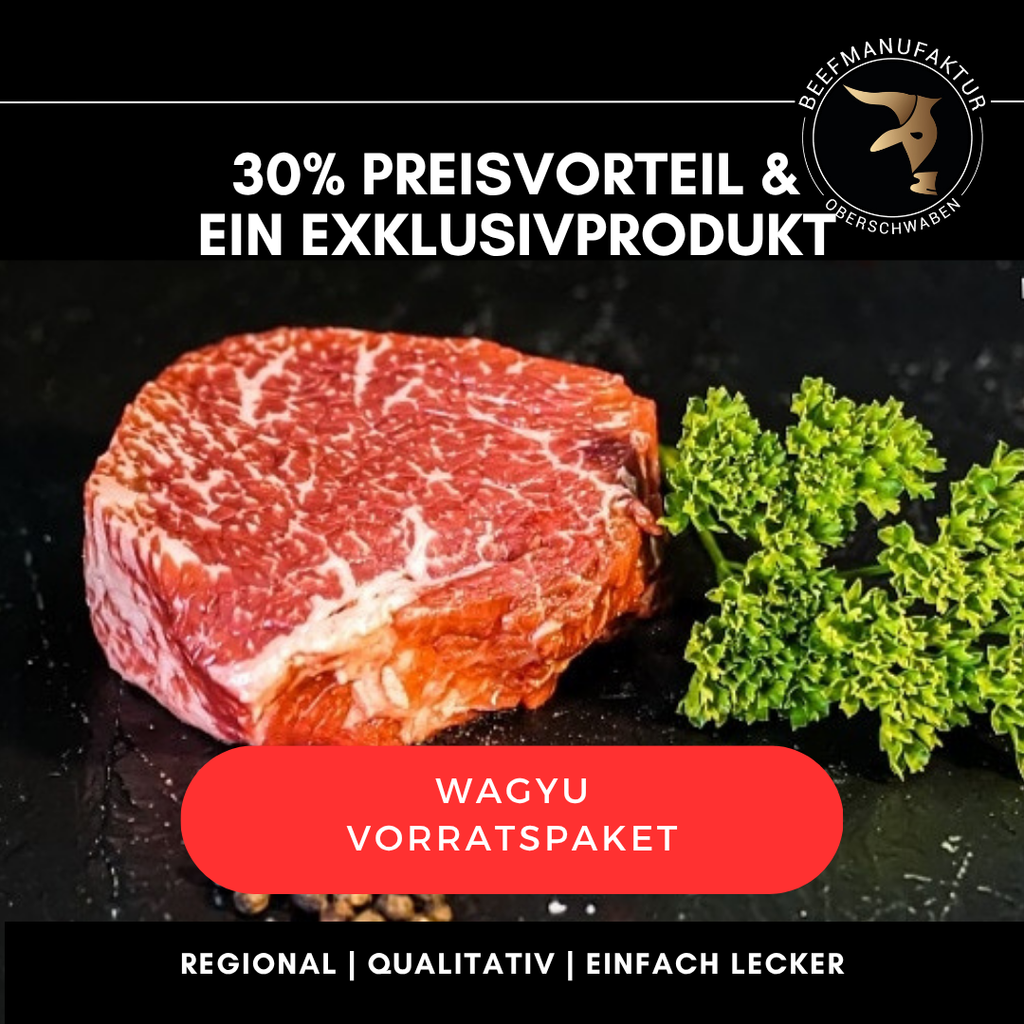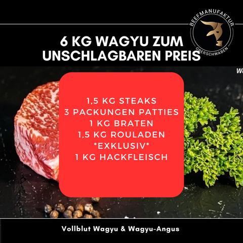Vollblut Wagyu und Wagyu-Angus-Kreuzung gemischt. Die Gewichtsangaben sind nicht verbindlich und können leicht variieren.
